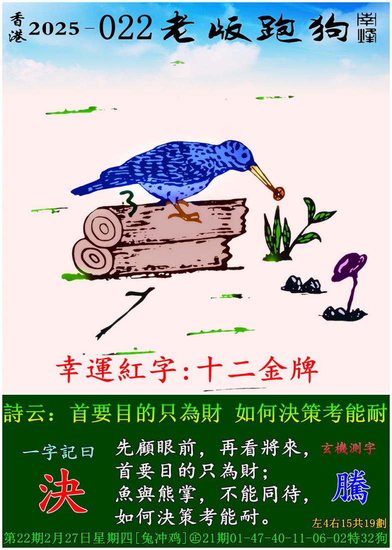 022期老版跑狗一字記之曰:【決】 詩雲:首要目的只為財,如何決策考能耐。
