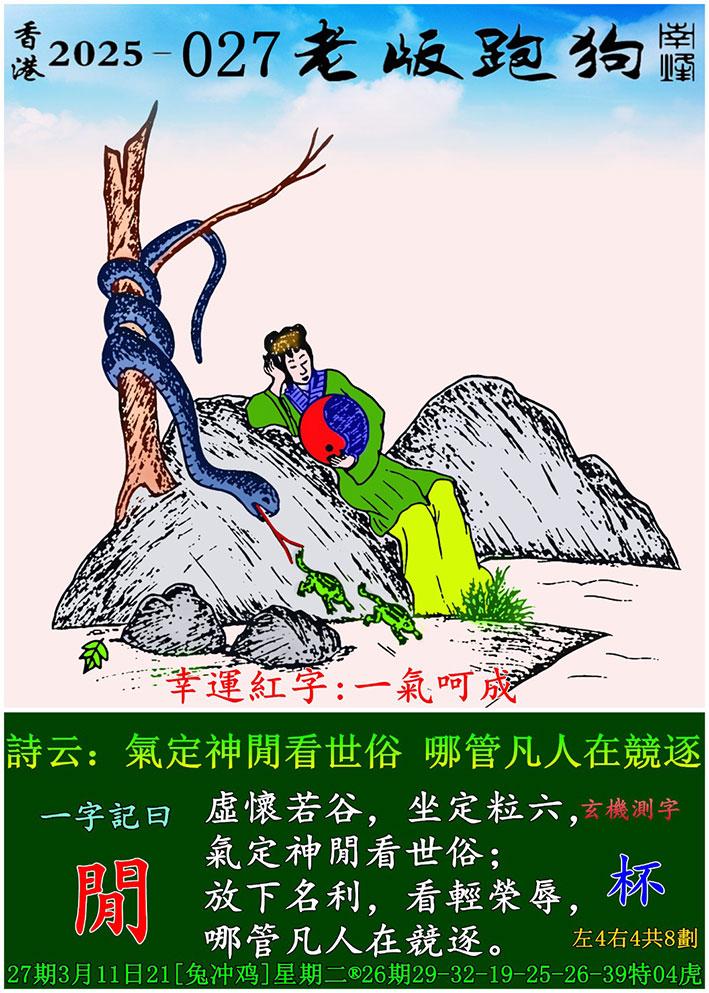 027期老版跑狗一字記之曰:【閒】 詩雲:氣定神閒看世俗,哪管凡人在競逐。