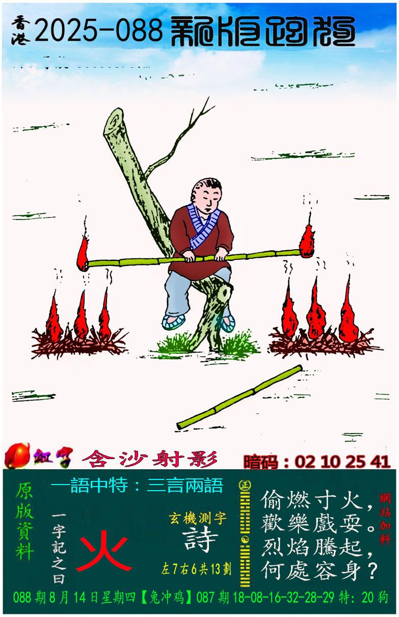 088期新版跑狗一字記之曰:【火】玄機測字:《詩》 一語中特:三言兩語