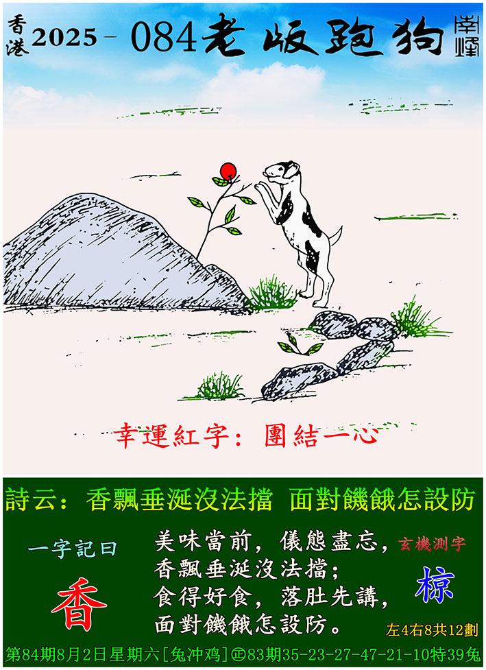 084期老版跑狗一字記之曰:【香】 詩雲:香飄垂涎沒法擋,面對饑餓怎設防。