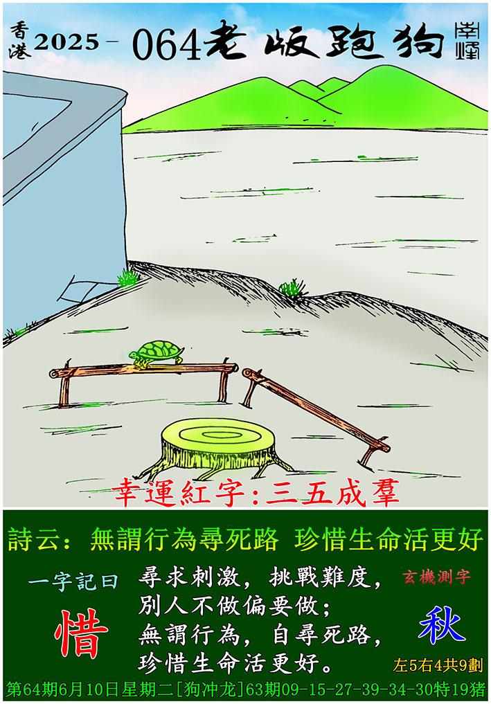 064期老版跑狗一字記之曰:【惜】 詩雲:無謂行為尋死路,珍惜生命活更好。