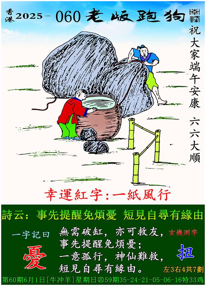 060期老版跑狗一字記之曰:【憂】 詩雲:事先提醒免煩憂,短見自尋有緣由。