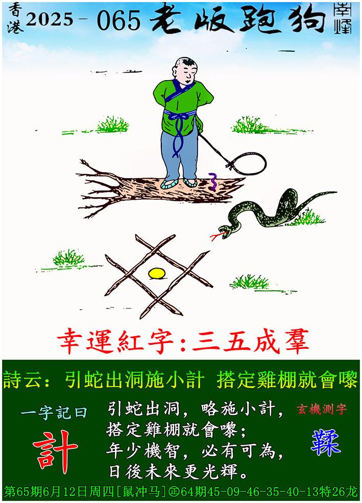 065期老版跑狗一字記之曰:【計】 詩雲:引蛇出洞施小計,搭定雞棚就會嚟。