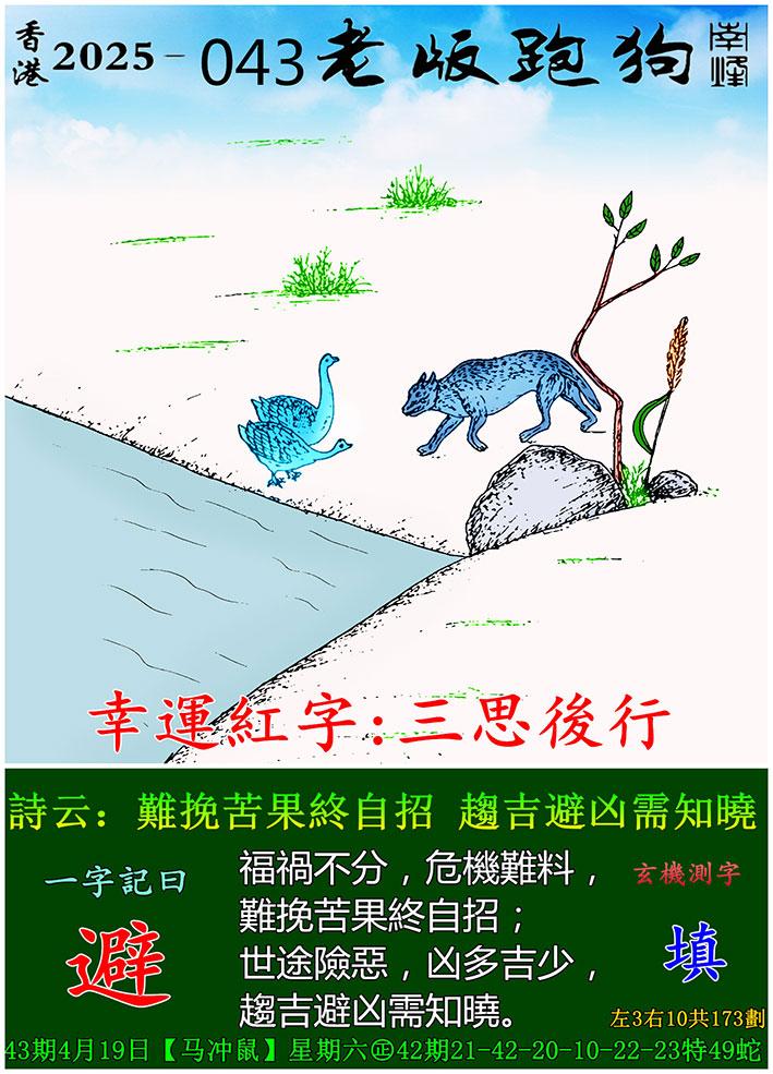 043期老版跑狗一字記之曰:【避】 詩雲:難挽苦果終自招,趨吉避凶需知曉。
