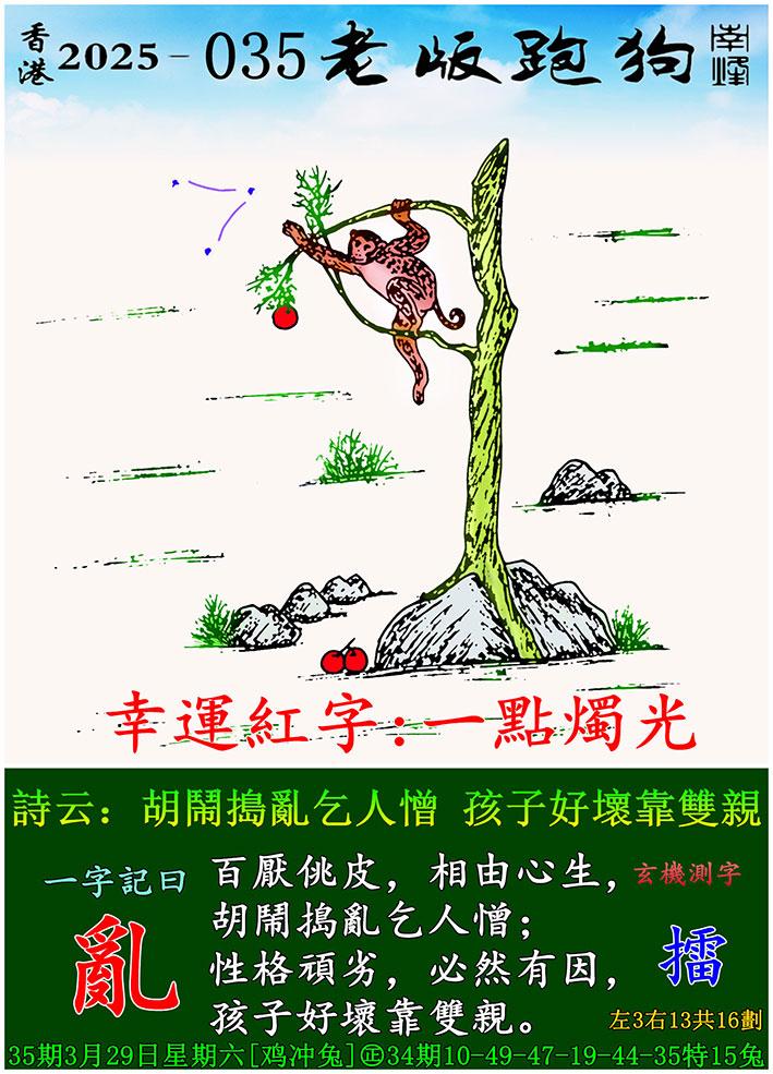 035期老版跑狗一字記之曰:【亂】 詩雲:胡鬧搗亂乞人憎,孩子好壞靠雙親。