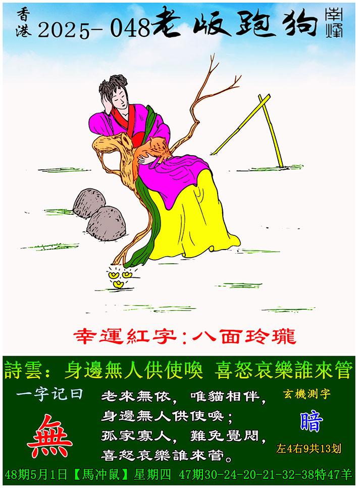 048期老版跑狗一字記之曰:【無】 詩雲:身邊無人供使喚,喜怒哀樂誰來管。