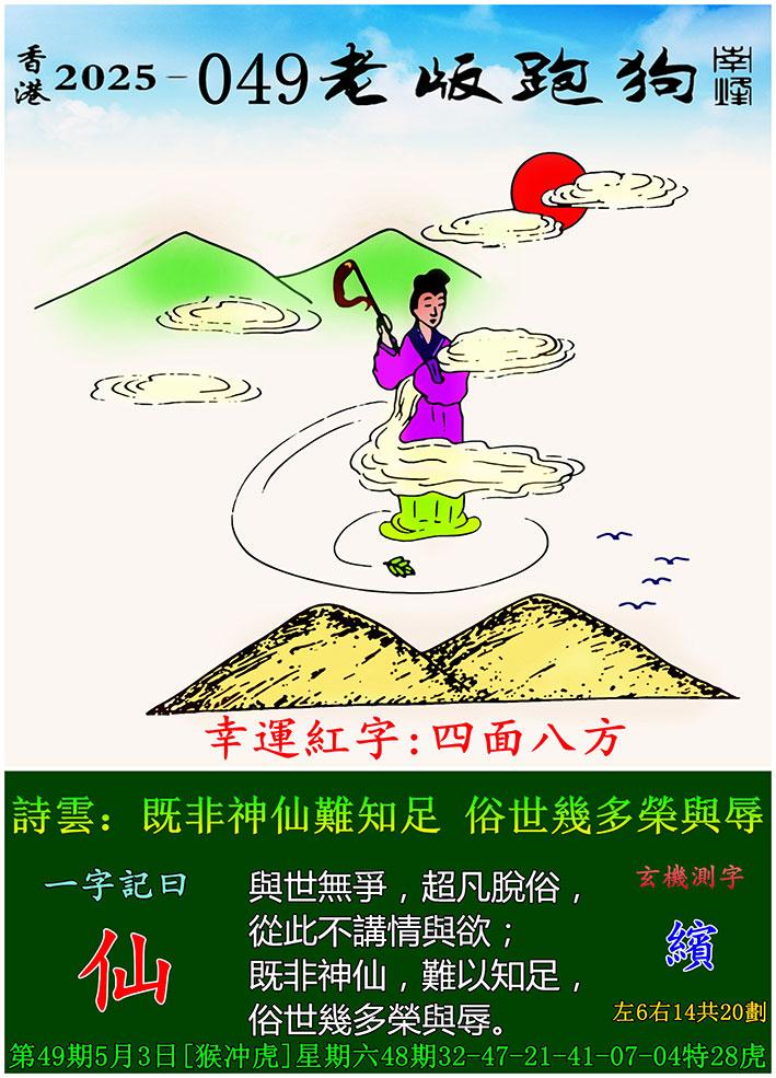 049期老版跑狗一字記之曰:【仙】 詩雲:既非神仙難知足,俗世幾多榮與辱。