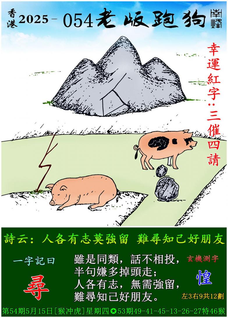 054期老版跑狗一字記之曰:【尋】 詩雲:人各有志莫強留,難尋知己好朋友。